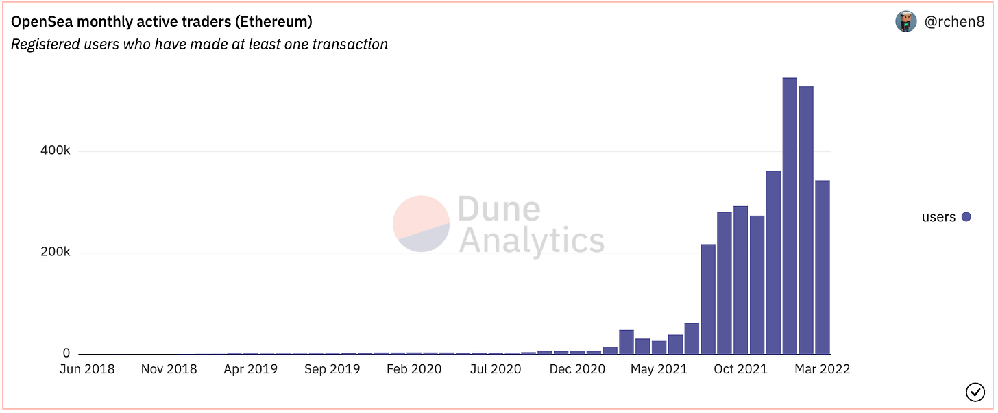 The number of active traders on OpenSea, as represented in the chart below, is on track to meet both January ‘22 and February ‘22 (which were the highest trading months in OpenSea’s history).